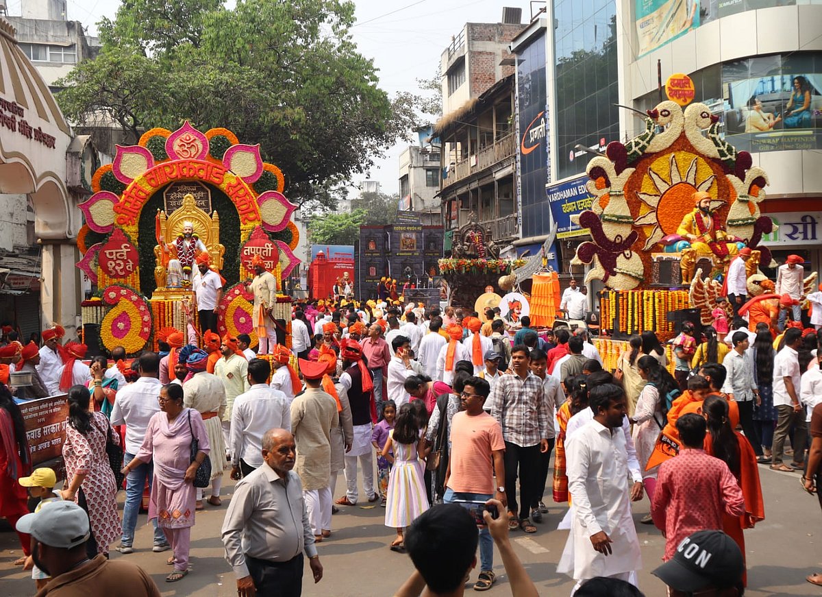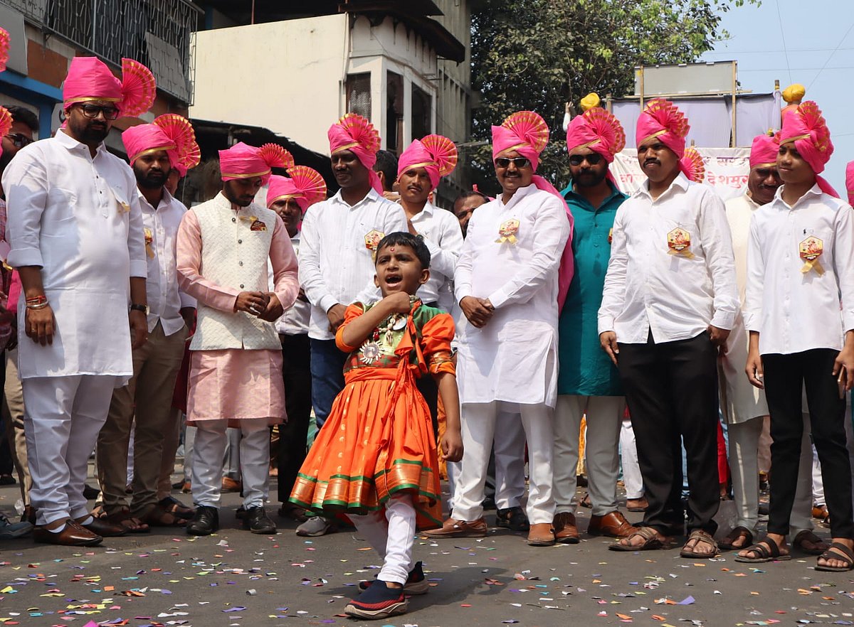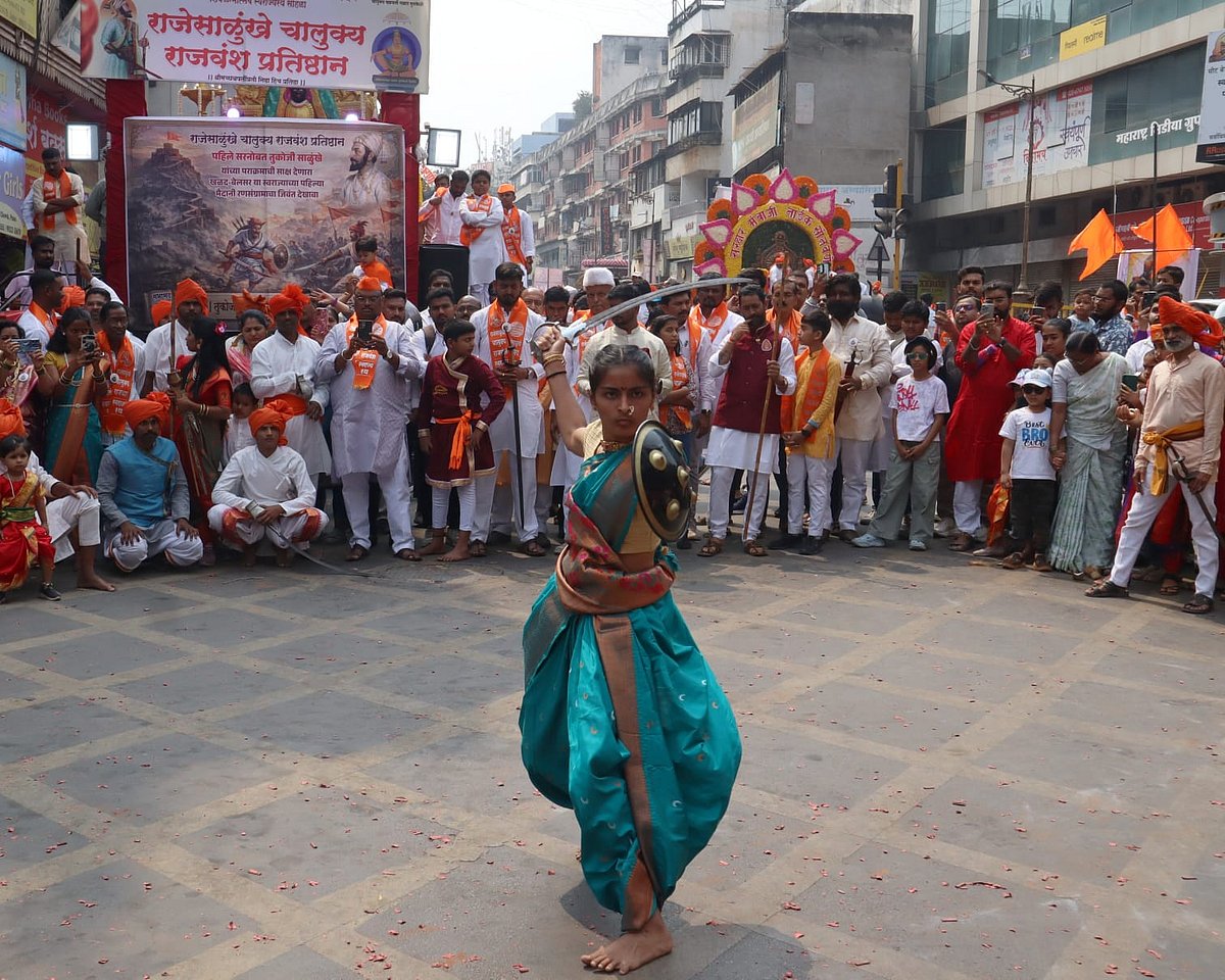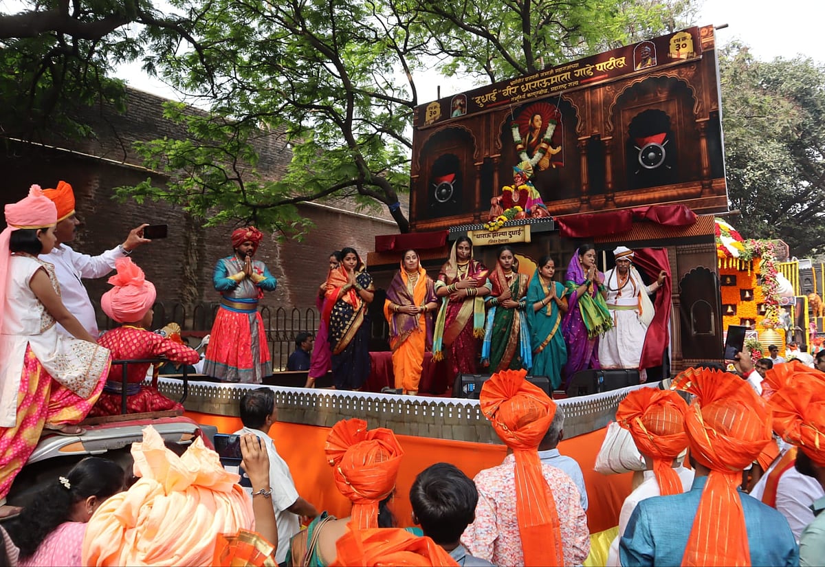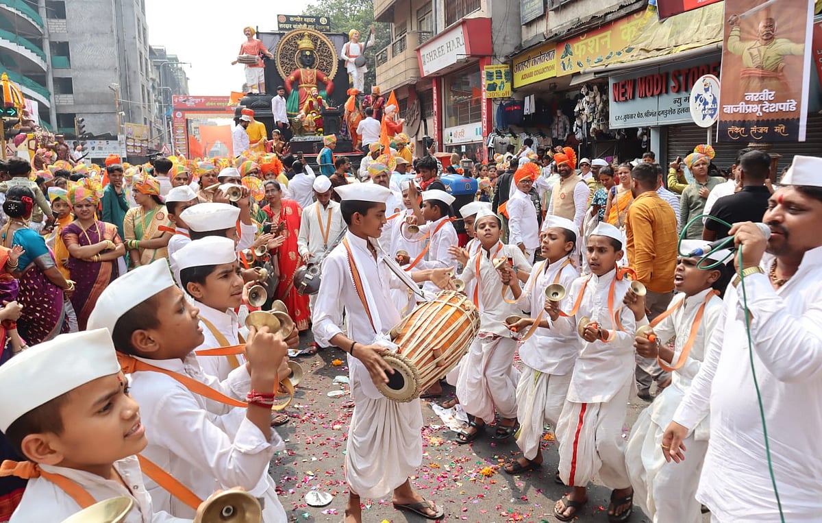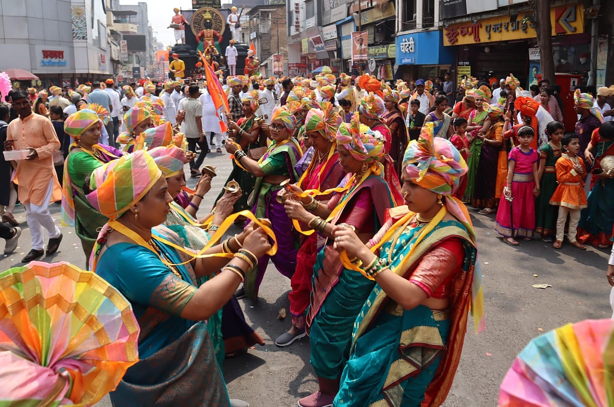 From the early hours of the morning, city roads transformed into a sea of saffron as processions moved through bustling marketplaces and historic lanes. Women dressed in traditional nauvari sarees, adorned with colourful phetas, performed lezim and folk dances, adding rhythm and grace to the celebrations. Their synchronised movements reflected not just artistic expression but also a deep-rooted connection to Maharashtra’s cultural heritage.