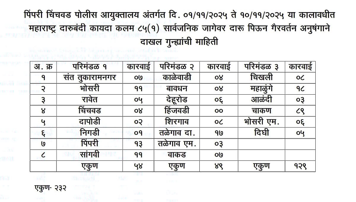 In a 10-day crackdown on alcohol consumption in public places, the Pimpri-Chinchwad Police booked 232 individuals.
