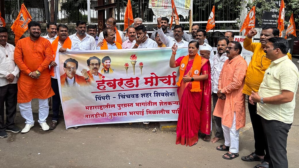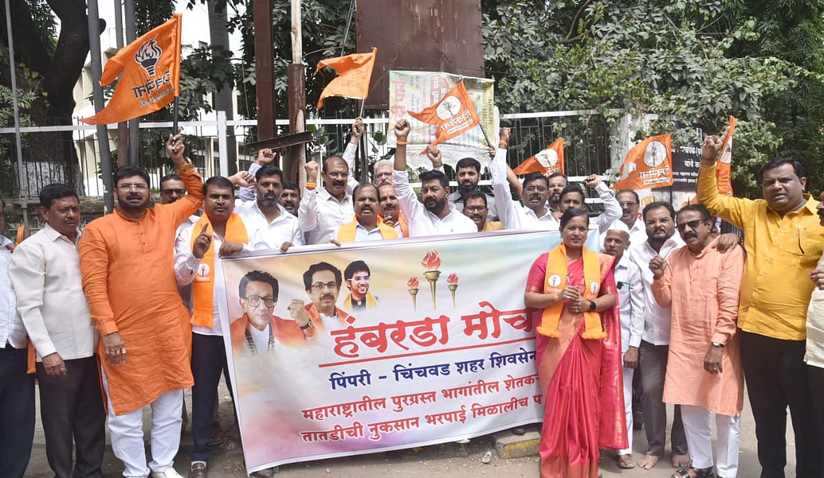 Pimpri-Chinchwad: The Shiv Sena (Uddhav Balasaheb Thackeray) Pimpri-Chinchwad city unit organised a protest march on Wednesday in front of the Tehsildar's office in Nigdi. They demanded adequate compensation for farmers affected by excessive rainfall and a complete loan waiver for farmers in Maharashtra.