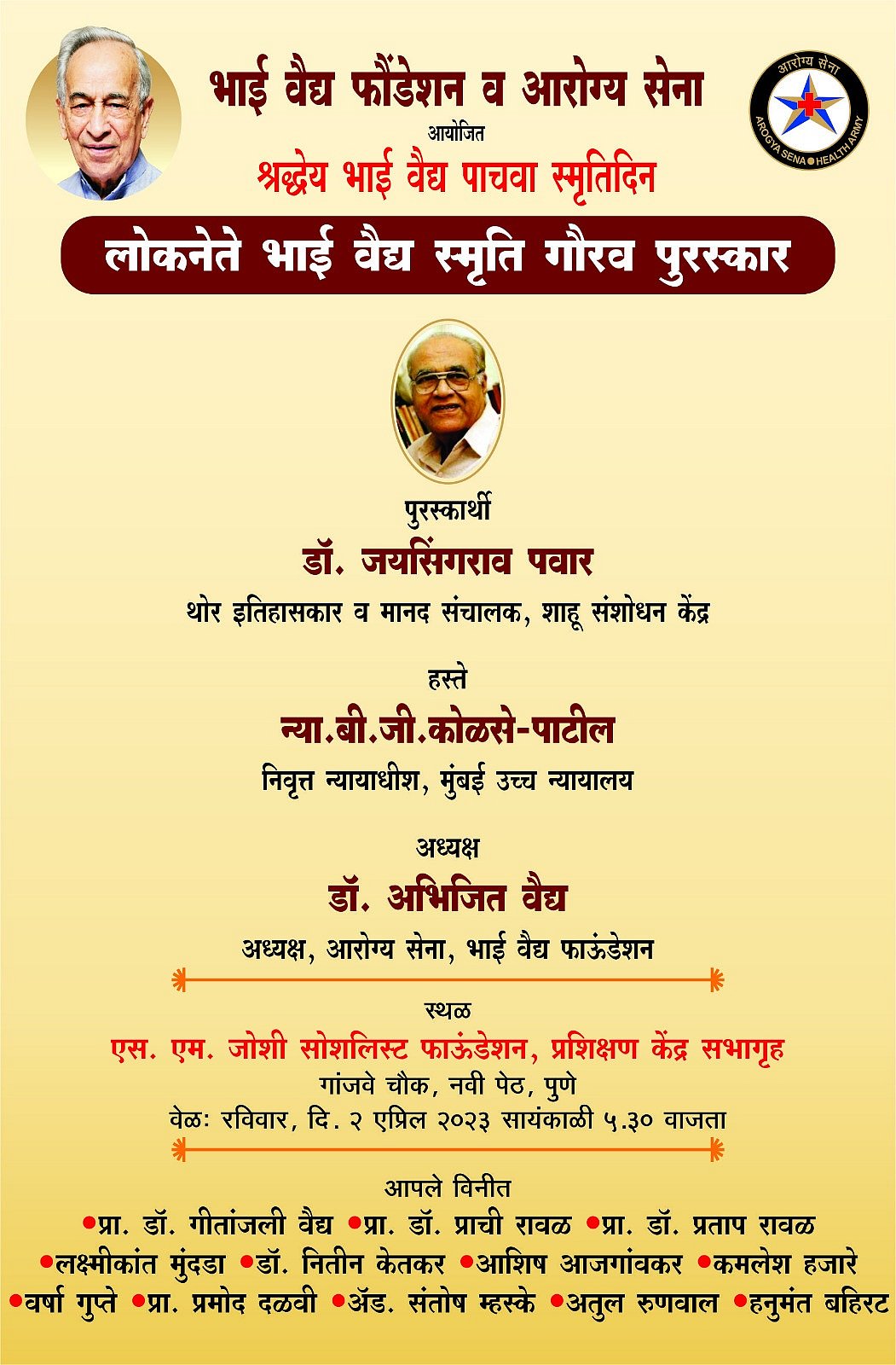 On the occasion of late socialist leader Bhai Vaidya's 5th death anniversary, the prestigious 'Loknete Bhai Vaidya Smrutigaurav (Commemorative) Award 2023' has been announced to Kolhapur's senior historian Dr Jaysingrao Pawar.