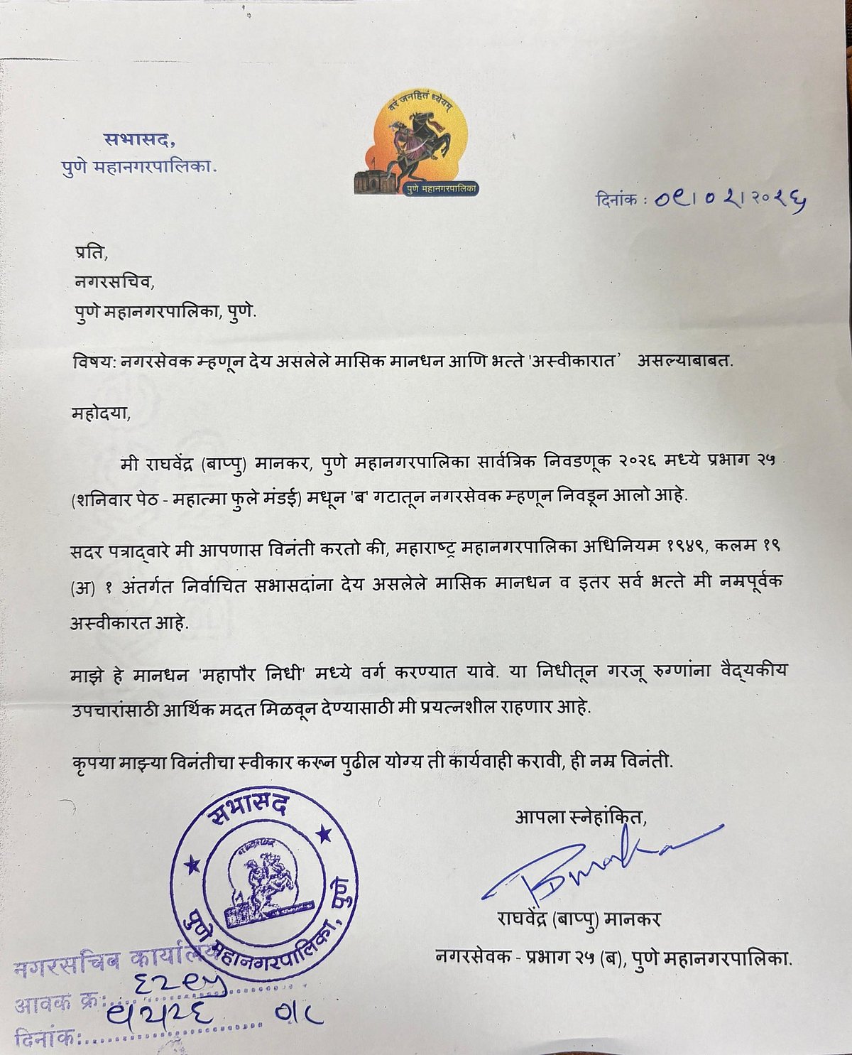 In a letter, the Bharatiya Janata Party (BJP) leader wrote, “I, Raghvendra Mankar, have won the PMC Elections 2026 from Ward No. 25B Shaniwar Peth–Mahatma Phule Mandai. Through this letter, I want to let you know that I won’t be accepting my monthly honorarium and allowances as per Section 19(A) of the Maharashtra Municipal Corporation Act, 1949.”