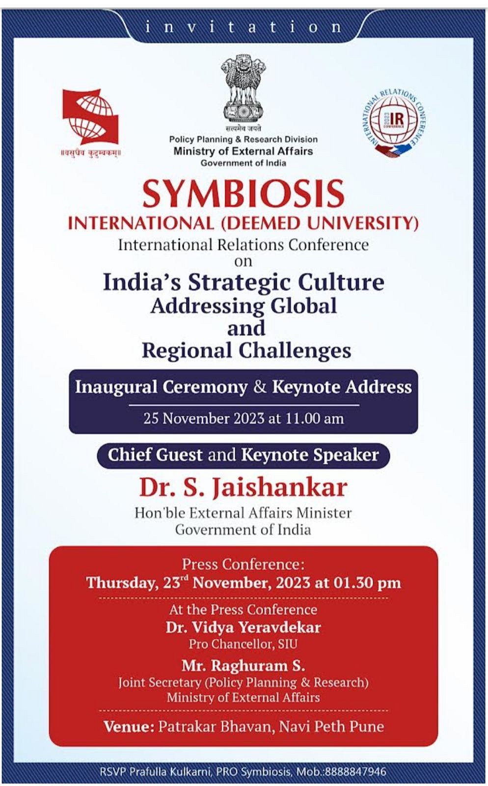 External Affairs Minister S Jaishankar is set to deliver the keynote address at the inaugural session of the International Relations Conference 2023 at Symbiosis International (Deemed University) in Pune's Lavale on Saturday, November 25.