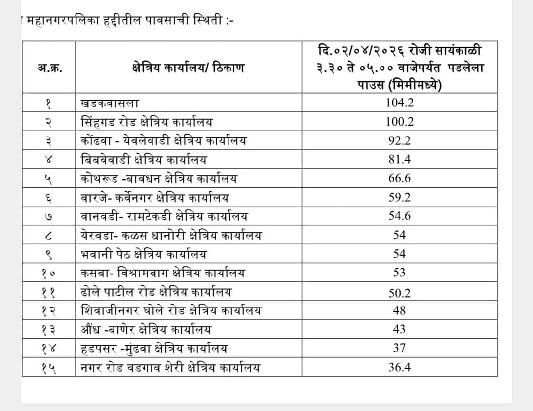 The National Defence Academy (NDA) recorded the highest rainfall at 84 mm. Shivajinagar received 65 mm, Hadapsar 42 mm, Pashan 36.3 mm, Chinchwad 28.5 mm, and Lohegaon 21 mm of rainfall.