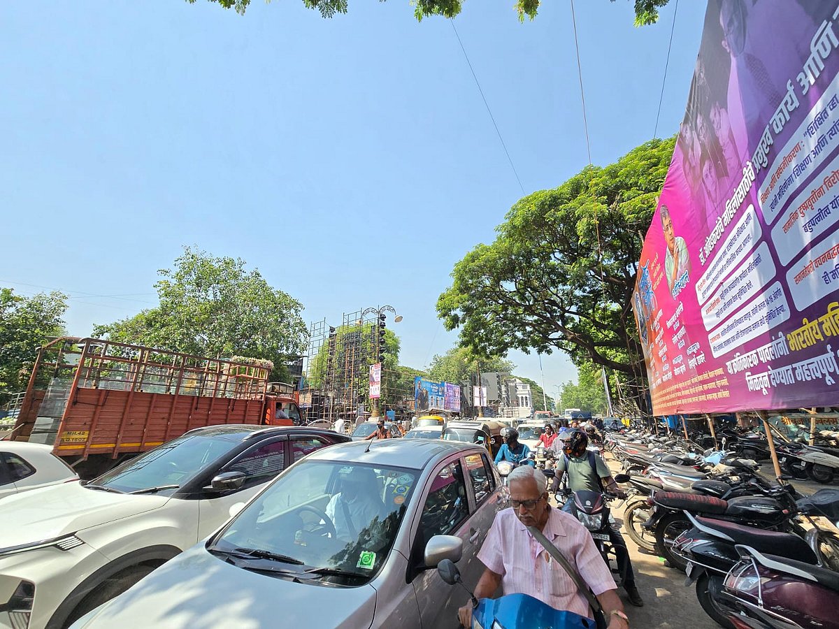 Severe traffic congestion was witnessed on Sinhagad Road on Monday morning as large-scale preparations for Dr Babasaheb Ambedkar Jayanti disrupted vehicular movement between Dandekar Bridge and Rajaram Flyover. Commuters were left stranded for long durations as decorative structures, DJ setups and lighting installations occupied significant portions of the road.