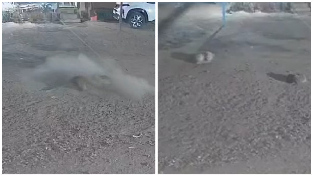 The incident was documented in two separate CCTV footages that have since gone viral across social media platforms. The recordings reveal three dogs resting in a common residential area during the dead of night. One of the larger dogs appears to sense a disturbance in the shadows and begins to retreat cautiously from the frame.
