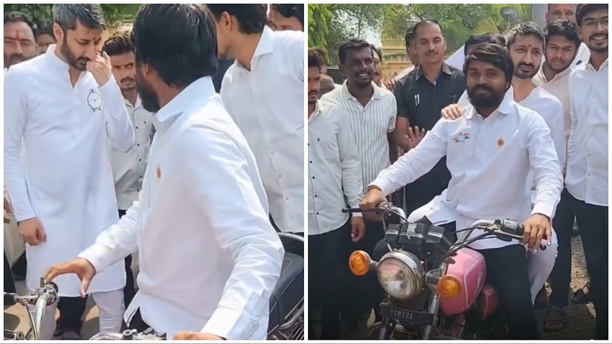 The supporter insisted that Jay Pawar sit on the motorcycle. Responding to the enthusiasm, Jay Pawar agreed without hesitation.