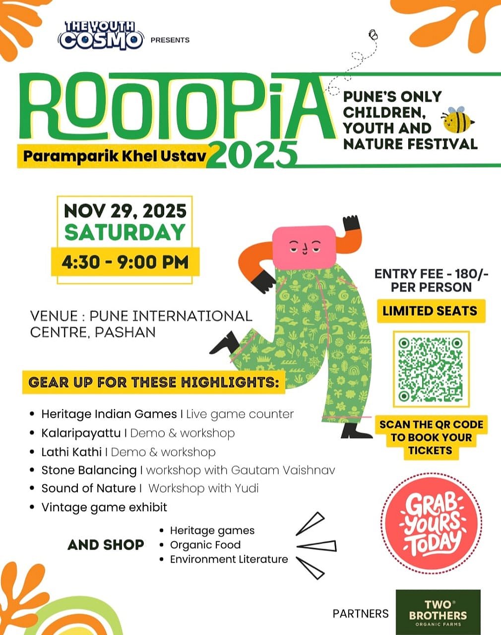 Rootopia 2025 will be held on Saturday, November 29, from 4:30 pm to 9 pm at the Pune International Centre in Pashan. It is open to children aged six and above, along with their families. Tickets are available on the Youth COSMO website.