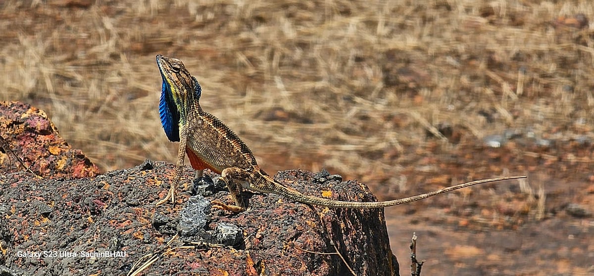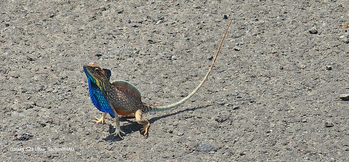 To protect itself in a dangerous situation, the lizard can change its colour; that's why it is called 'colour-changing lizard' in Marathi. It has three colors—blue, black, and orange—on its neck fan. The fan on the neck of this lizard is constantly moving in and out. This reptile can be found in large numbers in the forests of Koyna Sanctuary, west of Sahyadri.