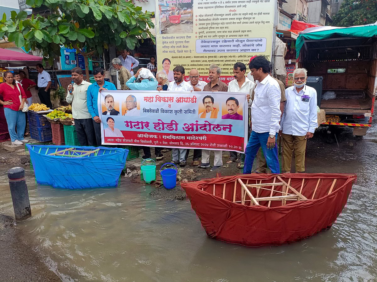 Residents of Mahesh Society Chowk in Pune's Bibwewadi, along with party workers from the Maha Vikas Aghadi (MVA), staged a protest on Monday against the prolonged drainage issue at the main chowk causing regular traffic congestion, mosquito breeding, and health issues for the commuters.