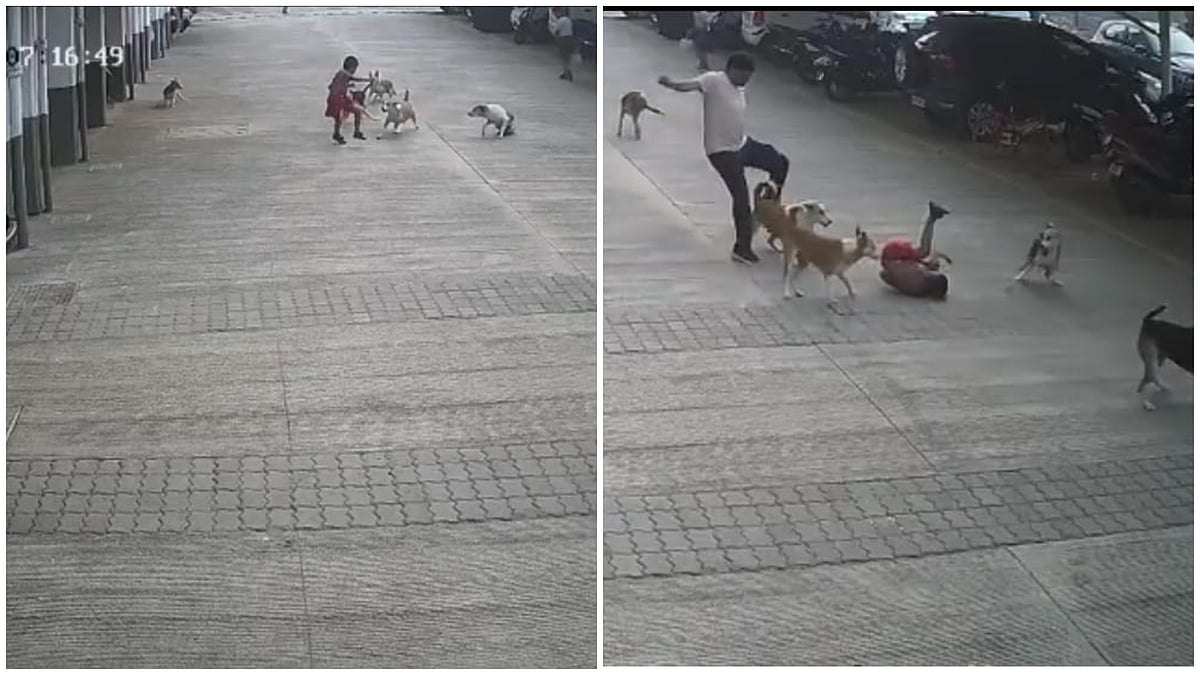The child, who was in his school uniform, was walking within the society's premises, an area meant to be safe, when he was suddenly attacked by a group of stray dogs. Startled by the sudden attack, he attempted to run away but lost his balance and fell to the ground, where the dogs were very close to bite him.