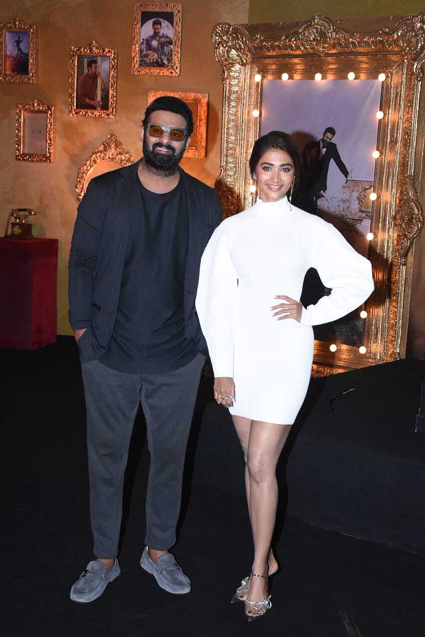 Prabhas sported an all-black look, while Pooja complimented him in a white bodycon dress.