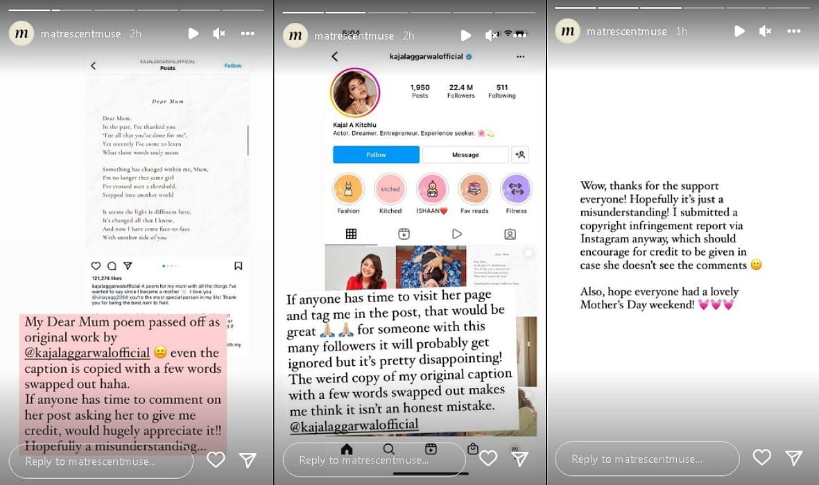 However, it was also noticed by a writer named Sarah, who then claimed that the poem was her original work and accused Kajal of copying it. She wrote, "My Dear Mum poem passed off as original work by @kajalaggarwalofficial. Even the caption is copied with a few words swapped out haha. If anyone has time to comment on her post asking her to give me credit, would hugely appreciate it! Hopefully a misunderstanding..."
