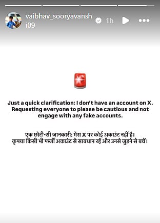 In an Instagram story, Vaibhav Suryavanshi confirmed that he in fact did not have an X account and urged users to not engage with the same.