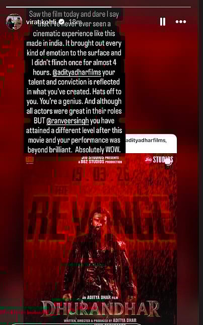 Bengaluru, April 6: Star Indian batter and Royal Challengers Bengaluru (RCB) player Virat Kohli on Monday watched "Dhurandhar: The Revenge" and shared an Instagram Story praising Director Aditya Dhar and actor Ranveer Singh. He called it a powerful and emotional cinematic experience.