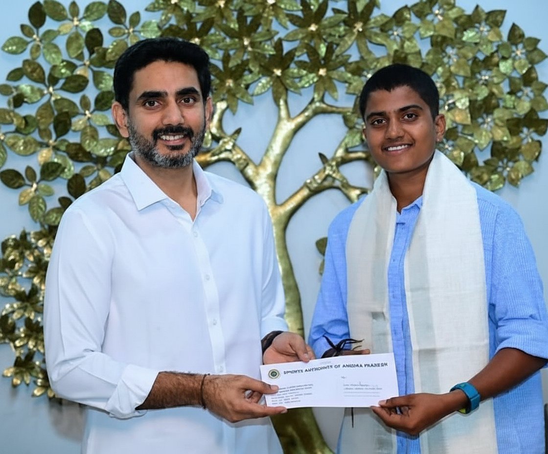 Education and IT Minister Nara Lokesh personally met Shree Charani at his Undavalli residence and presented her with the cheque on behalf of the coalition government.