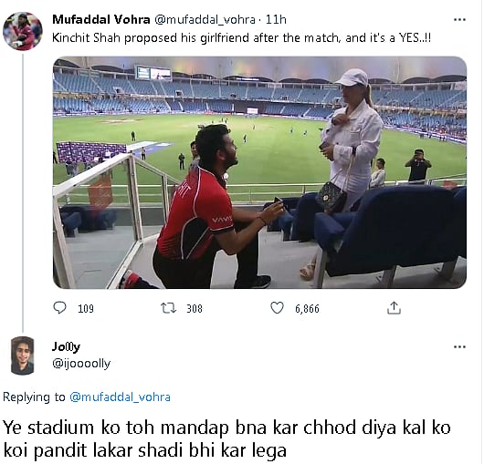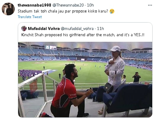 Concurrently, a user was busy looking for his "match". They wrote, "Stadium tak toh chala jau par propose kisko karu [I can go to a stadium but who do I propose]?"