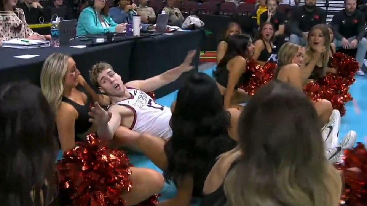 The incident occurred during Gonzaga's game against the Oregon State Beavers men's basketball at Orleans Arena. While chasing the ball near the baseline after a lay-up attempt, Mario Saint-Supery was unable to slow down and crashed into the courtside area and landed directly into the lap of the Oregon State cheerleader.