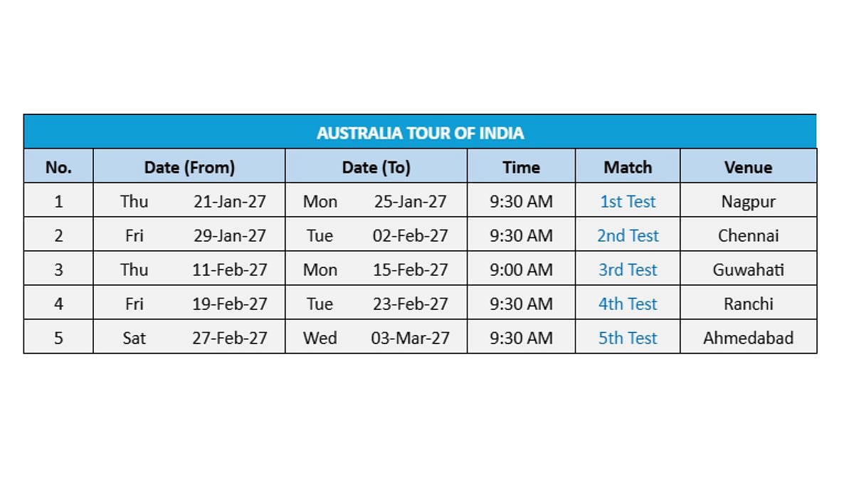 The season will culminate with the prestigious and much-anticipated Border-Gavaskar Trophy, featuring a five-match Test series against Australia, beginning on January 21, 2027, in Nagpur. The contest will then move to Chennai, Guwahati, Ranchi and Ahmedabad, promising a compelling battle between two of the premier sides in world cricket.