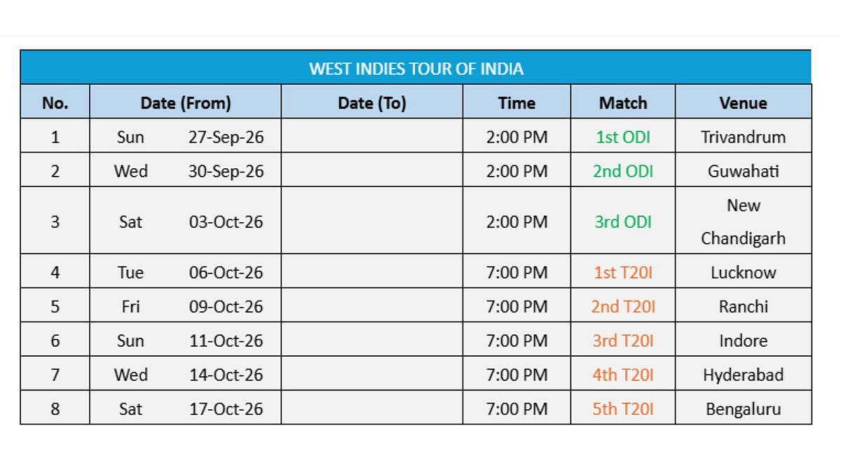The season will commence with the West Indies tour of India, starting on September 27, 2026. The tour will feature a three-match ODI series followed by a five-match T20I series. The ODIs will be played in Trivandrum, Guwahati and New Chandigarh, before the action shifts to the T20Is, which will be hosted across Lucknow, Ranchi, Indore, Hyderabad and Bengaluru.