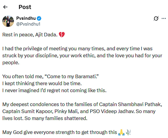 Concluding her message, Sindhu prayed for strength and courage for the bereaved families, echoing the sentiments of a nation in mourning. Her tribute joined a growing chorus of condolences from across the sports and political fraternity, underlining Ajit Pawar’s lasting impact beyond politics.