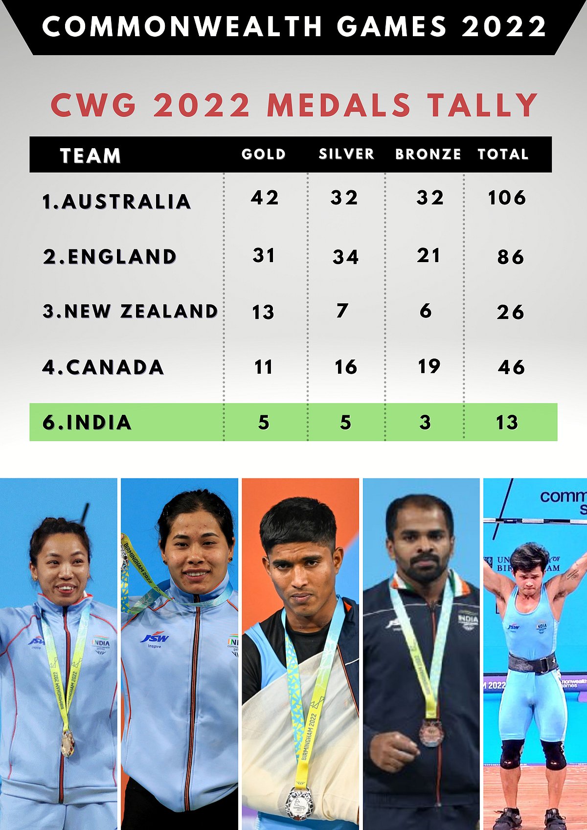 Birmingham: It was another successful day for India as they added four more medals to their tally, taking the total to 13 which includes 5 gold, 5 silver and 3 bronze medals.