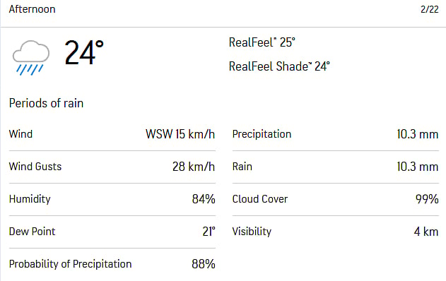 According to the latest weather update, the afternoon is likely to see periods of rain. The temperature is expected to remain around 24 degrees Celsius, with a RealFeel of about 25 degrees Celsius.