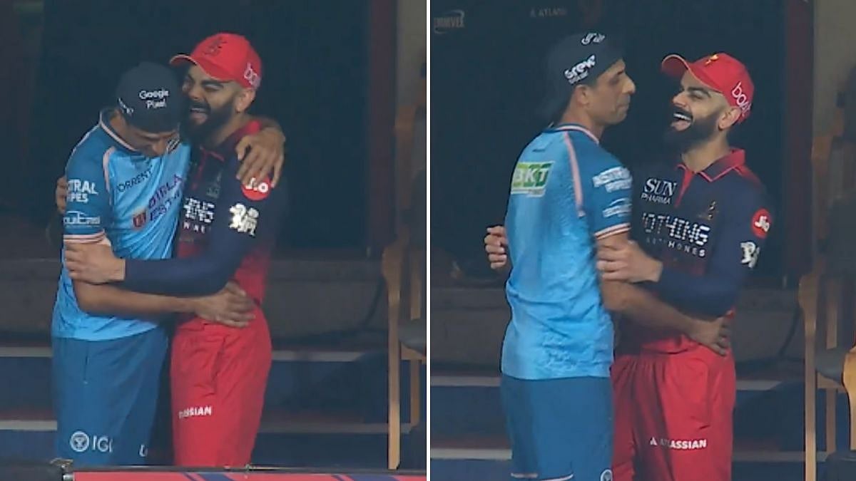 In a now viral video, Ashish Nehra is seen greeting Virat Kohli in the dressing room at the M Chinnaswamy Stadium in Bengaluru. Kohli was booming with a smile as he met his former teammate and coach, hugging the left-arm pacer and sharing a few laughs.