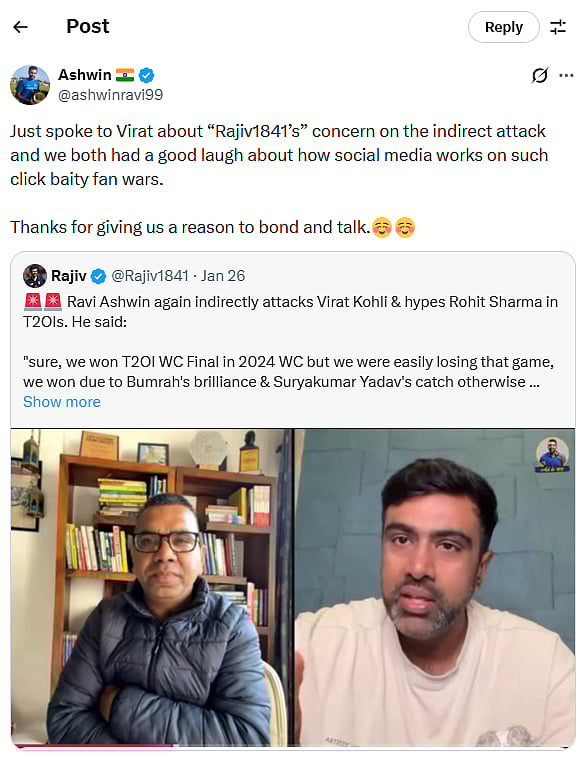 Ashwin responded firmly to one such post on X, dismissing the claims and clarifying that there was no rift between him and Kohli. He revealed that he had personally spoken to Kohli about the matter, adding that both shared a laugh over how social media often fuels “clickbait fan wars.” Ashwin thanked the discussion for giving them a reason to reconnect and bond.