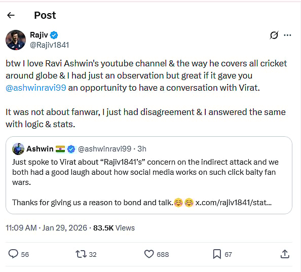 Following Ashwin’s clarification, the X user in question responded with a detailed post, stressing that there was no intention of starting a fan war. The user wrote, “btw I love Ravi Ashwin's YouTube channel & the way he covers all cricket around the globe & I had just an observation but great if it gave you an opportunity to have a conversation with Virat. It was not about fanwar, I just had disagreement & I answered the same with logic & stats.”