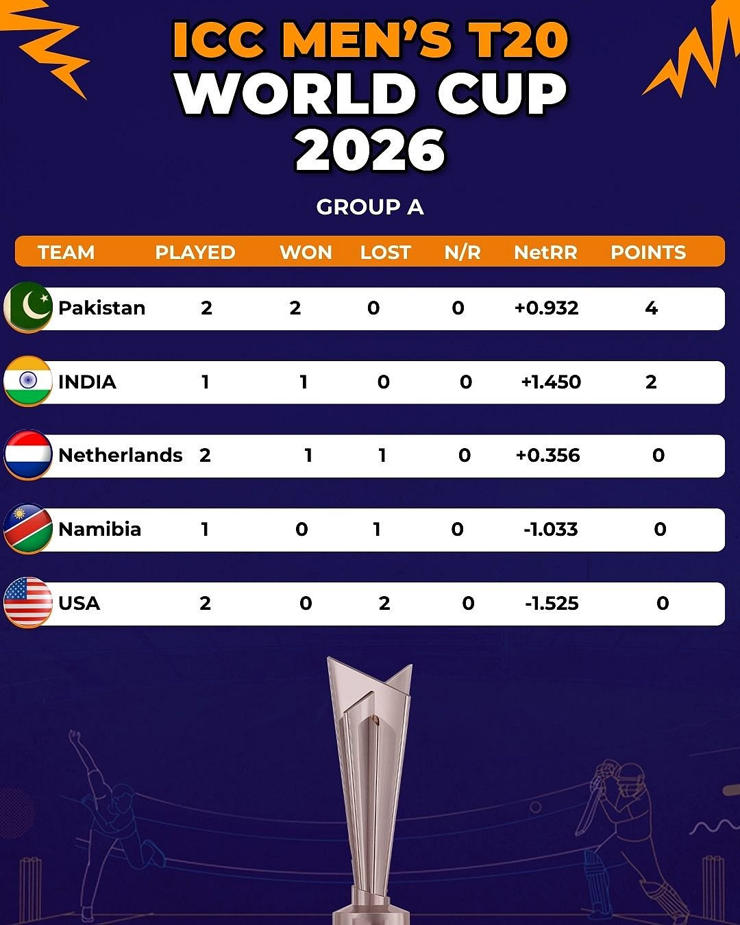 Pakistan are on top of the standings having clinched back to back wins over Netherlands and the USA. India registered a win over the USA, while Netherlands have a win and a loss on the board.