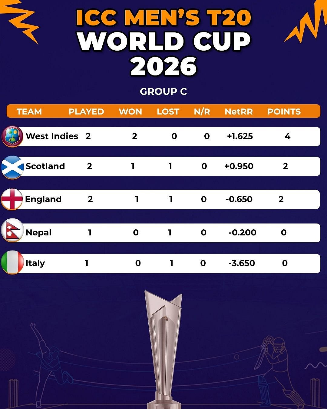 West Indies climbed to the top of Group C with convincing wins over England and Scotland. Scotland registered an important win over Italy, while England survived a nail-biter against Nepal.