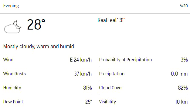 In the evening, the Barbados weather will be kinder to the match between India and Afghanistan. The humidity level is expected go down to 28 Degrees Celcius, with chances of rain is likely to be 3%. However, the cloud cover is anticipated to be 82%.