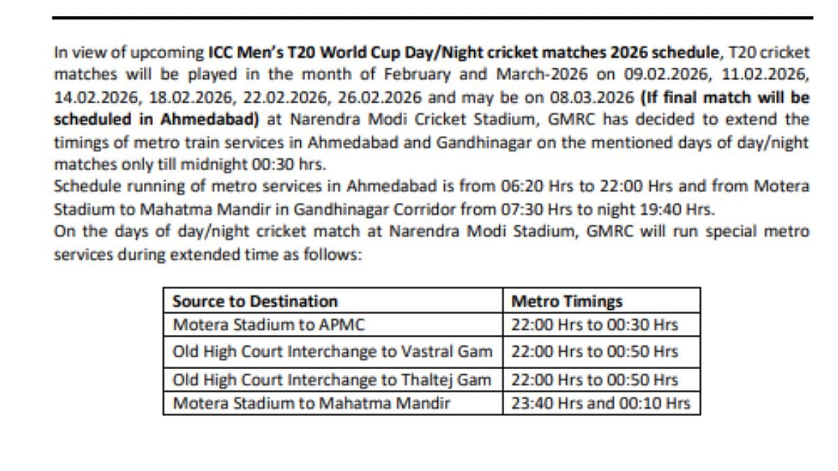 Ahmedabad: The Ahmedabad Traffic Police have announced road closure and alternate routes for the ICC Men's T20 World Cup 2026 final at the Narendra Modi Stadium on Sunday, March 8. Several roads around the stadium will remain closed to ensure the smooth movement of fans attending to watch the match.