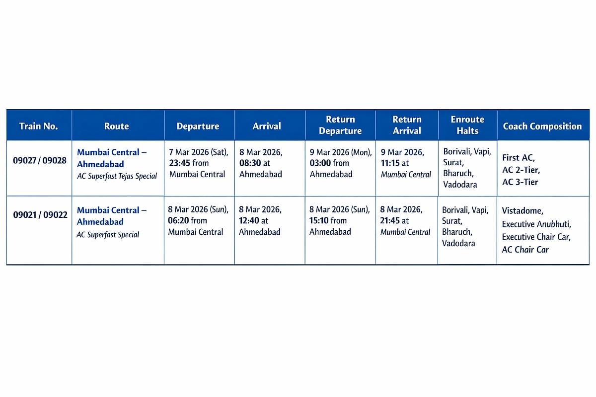 Train No. 09043 | Bandra Terminus – Ahmedabad. AC Superfast Special 09.03.2026 (Monday) – 1 Trip Departs Bandra Terminus – 14:30 hrs Arrives Ahmedabad – 22:55 hrs Via: Surat, Vadodara