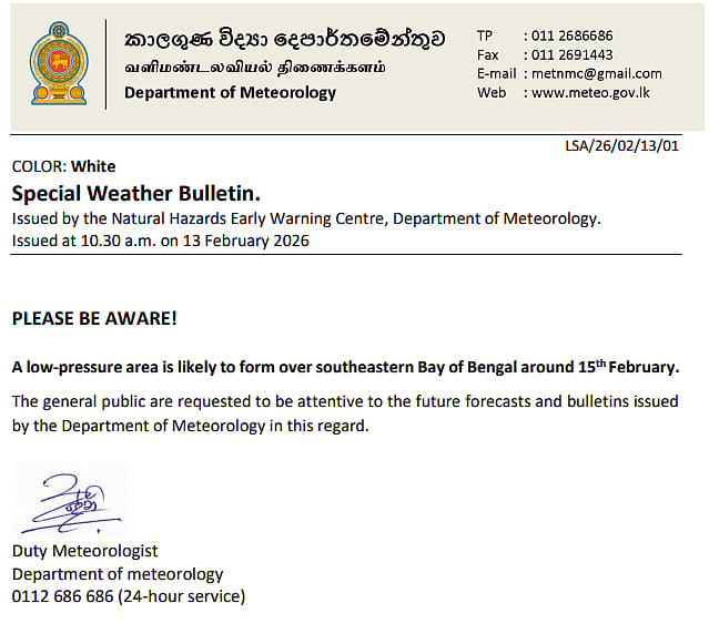According to the Special Weather Bulletin issued by the Sri Lankan Department of Meteorology, a low-pressure area is likely to form over the southeastern Bay of Bengal around February 15. The advisory asks the public to stay alert and follow the upcoming forecasts and updates. This development may influence the weather conditions in the region over the next few days.
