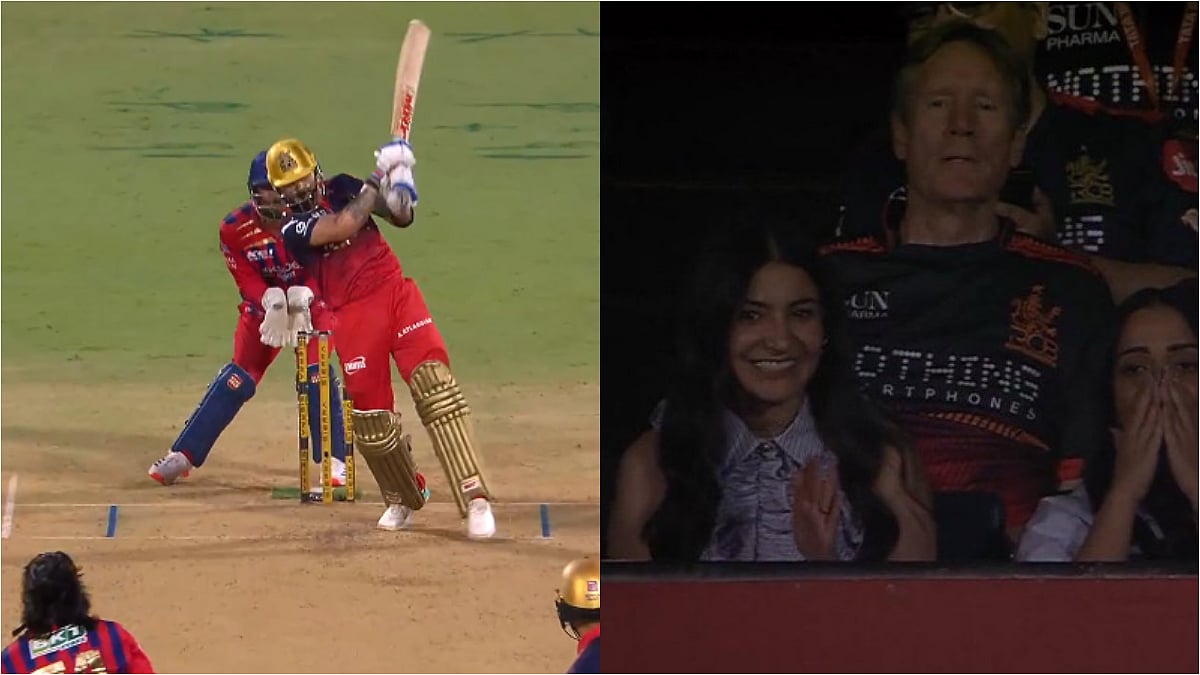 Anushka Sharma was all smiled and was seen applauding after Virat Kohli smashed a massive six on the second ball of LSG spinner Digvesh Singh Rathi which went sailing into the stands. Anushka could not stop herself from giving big smile over the shot. Anushka's reaction to Virat's massive six went viral on social media and the internet users are sharing it on social media.