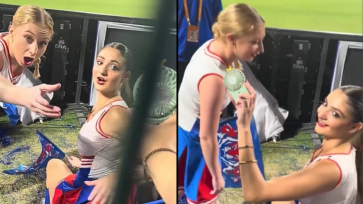 Amid the sweltering conditions typical of an Indian summer evening, a thoughtful spectator decided to do something unexpected. Spotting the cheer squad visibly dealing with the heat between performances, the spectator handed over a simple hand fan. What followed was a moment of pure, unfiltered joy.