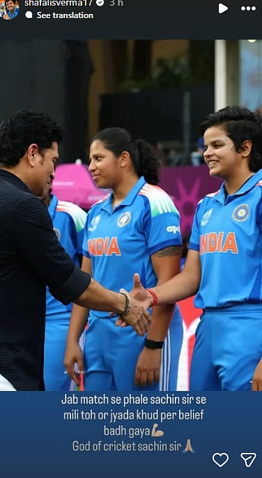 On Instagram, Shafali posted a picture of herself shaking hands with Tendulkar, captioning it: “Jab match se phale Sachin sir se mili toh aur jyada khud per belief badh gaya. God of cricket Sachin sir.” The heartfelt post reflects the inspiration and confidence she drew from meeting the living legend before taking the field, underlining the profound influence Tendulkar continues to have on the next generation of Indian cricketers.