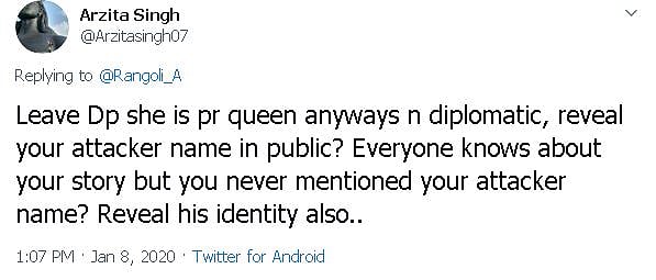 A Twitter user questioned the details of Rangoli's incident. "Reveal your attacker's name in public? Everyone knows about your story but you never mentioned your attacker name? Reveal his identity also," the user tweeted.