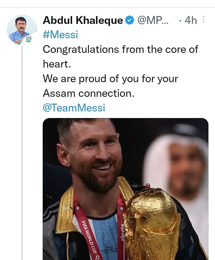 The MP, while congratulating Messi for Argentina's win at the Qatar World Cup on Twitter, wrote, “Congratulations from the core of my heart. We are proud of you for your Assam Connection.” (sic)