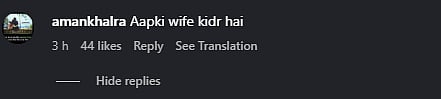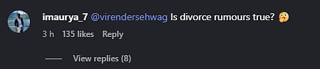 Within moments, the comments section was flooded with questions from fans asking where Sehwag's wife is. Some users went further, speculating about the couple’s relationship and fuelling unverified rumours of a possible separation.