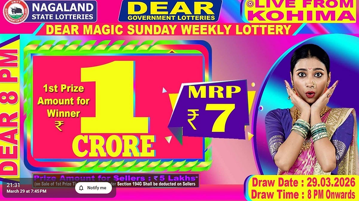 Nagaland State Lottery results for Dear Magic Sunday Night Lottery at 8 PM will be announced today, March 29, 2026. The top prize for the lottery is a whopping Rs 1 crore. We at FPJ are keeping track of the results. If you have bought a lottery ticket and want to know the winners, you can find the list here.