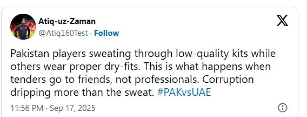 Atiq-uz-Zaman wrote on X that the Pakistan team has been given such low-quality jerseys that the players are drenched in sweat during matches. He said, "This is what happens when tenders are given to friends instead of professionals. Our players are drenched in sweat, and corruption is dripping even more than the sweat."