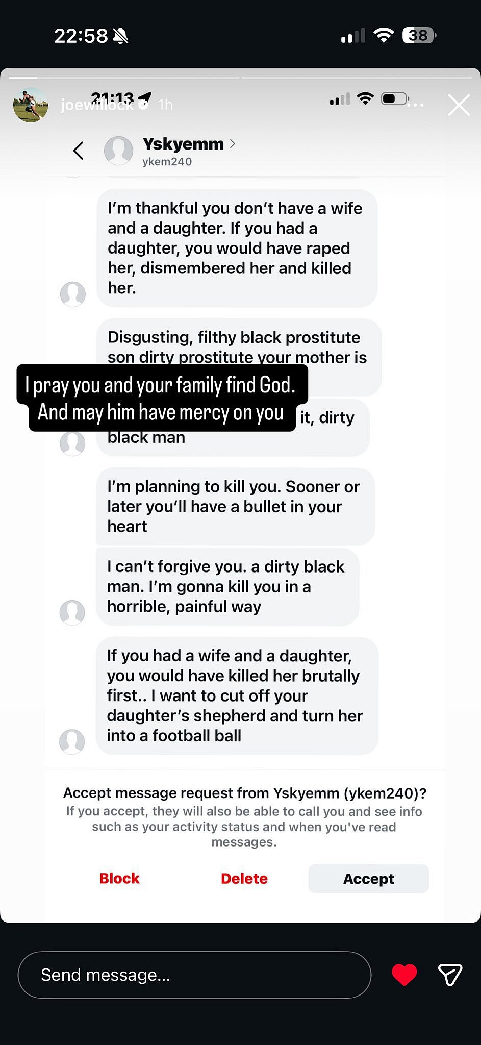 "This can only happen with meaningful action from Meta, Instagram's owners. We urge Meta to give the police all the information they need to identify the perpetrator, and to do so quickly. Removing content and applying message filters is not enough. Social media companies must do more to protect users and support the prosecution of those who seek to break the law on their platforms. We stand firmly with Joe and anyone else who faces this kind of abuse,” the club said.