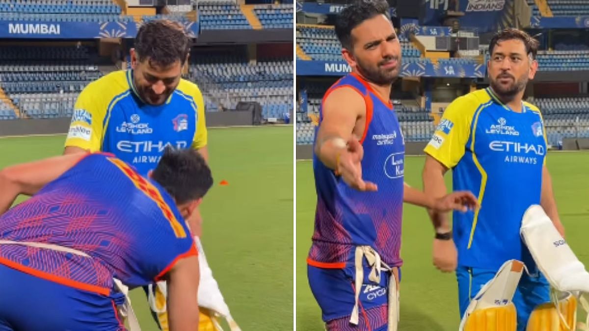 Former teammates MS Dhoni and Deepak Chahar shared a heartfelt moment during training at Wankhede before facing off in the MI vs CSK clash. Chahar, who played under Dhoni at CSK before joining MI, came up to meet his former captain. Dhoni quickly pointed that Deepak bought the camera along, before the pacer proceeded to touch the former Indian captain's feet.