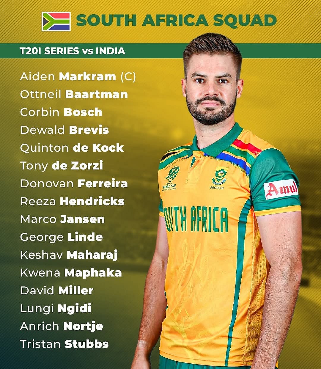 One-Day International (ODI) captain Temba Bavuma will lead the side in the three-match ODI series from 30 November to 06 December, with matches in Ranchi, Raipur and Visakhapatnam, while Aiden Markram returns to captain the T20 International (T20I) side in the five-match T20I series to be played across India from 09 to 19 December.