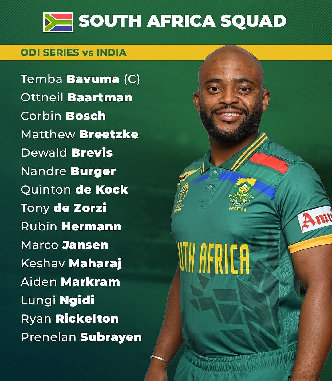 Proteas ODI squad against India: Temba Bavuma (c), Ottneil Baartman, Corbin Bosch, Matthew Breetzke, Dewald Brevis, Nandre Burger, Quinton de Kock, Tony de Zorzi, Rubin Hermann, Keshav Maharaj, Marco Jansen, Aiden Markram, Lungi Ngidi, Ryan Rickelton, Prenelan Subrayen.