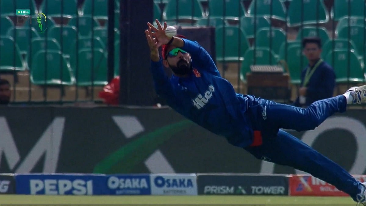 Shadab Khan took the catch to get rid of Abdullah Shafique. Shadab was fielding on Mid-off while Imad Wasim was bowling. Shafique played a lofted shot which was going a little farther from Shadab, however, he jumped to his right and still managed to catch the ball. He was around 5-6 feet above the ground while jumping to his right. He grabbed the catch and did not let the ball slip out of his hand.