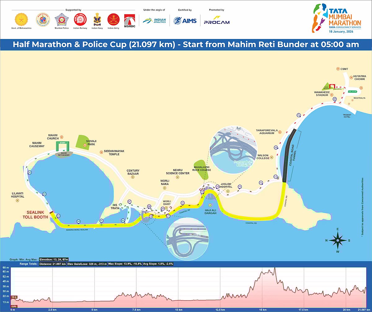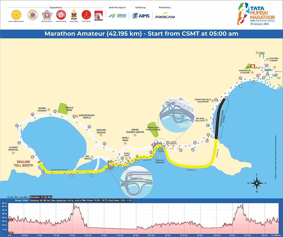 The marathon course begins at Chhatrapati Shivaji Maharaj Terminus (CSMT) and passes through iconic parts of Mumbai such as Marine Drive, Worli Sea Face and Bandra‑Worli Sea Link, before incorporating the new Coastal Road, a first for this edition, offering runners stunning views of the Arabian Sea.