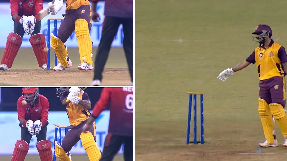 MP Tigers' bowler Pawan Negi hit the stumps, but the bails inexplicably stayed in place despite the stumps rattling. This unusual incident allowed Chirag to continue batting, and he eventually completed a magnificent century.
